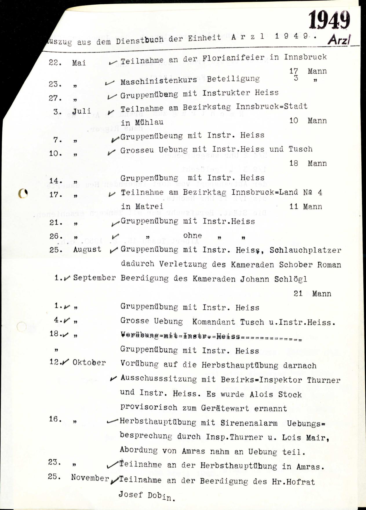 uszug aus dem Dienstbuch der Einheit Arzl 1949.