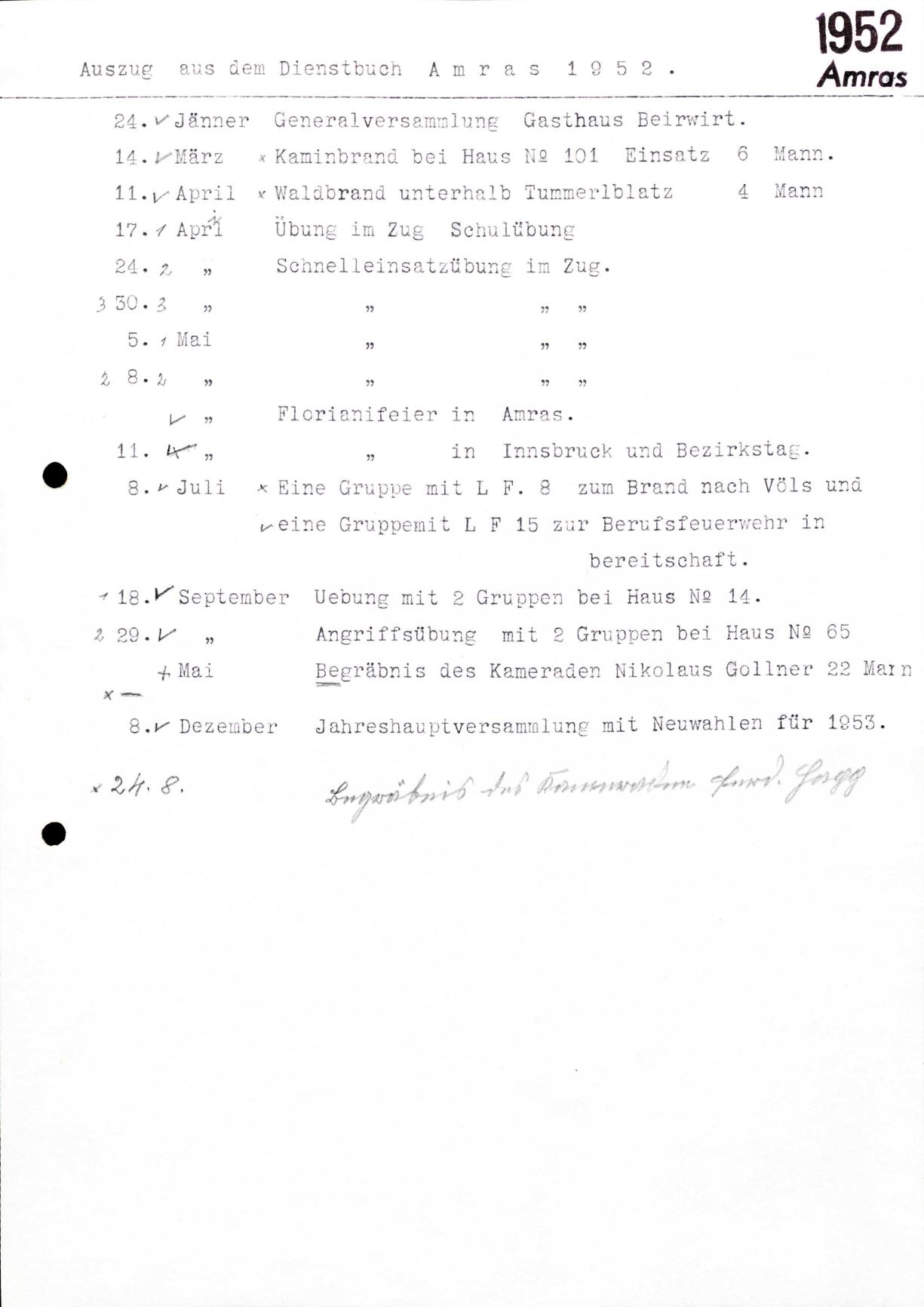 Auszug aus dem Dienstbuch der Einheit Vill 1952.
