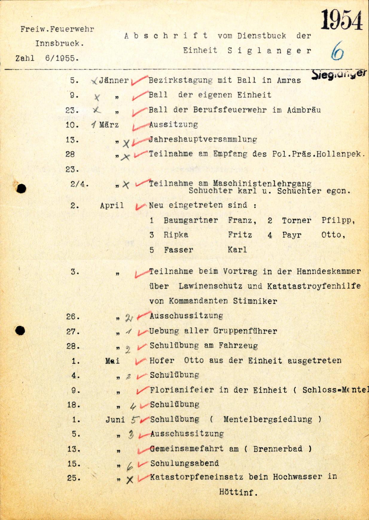 Freiw.Feuerwehr Abschri f t vom Dienstbuch der 1954