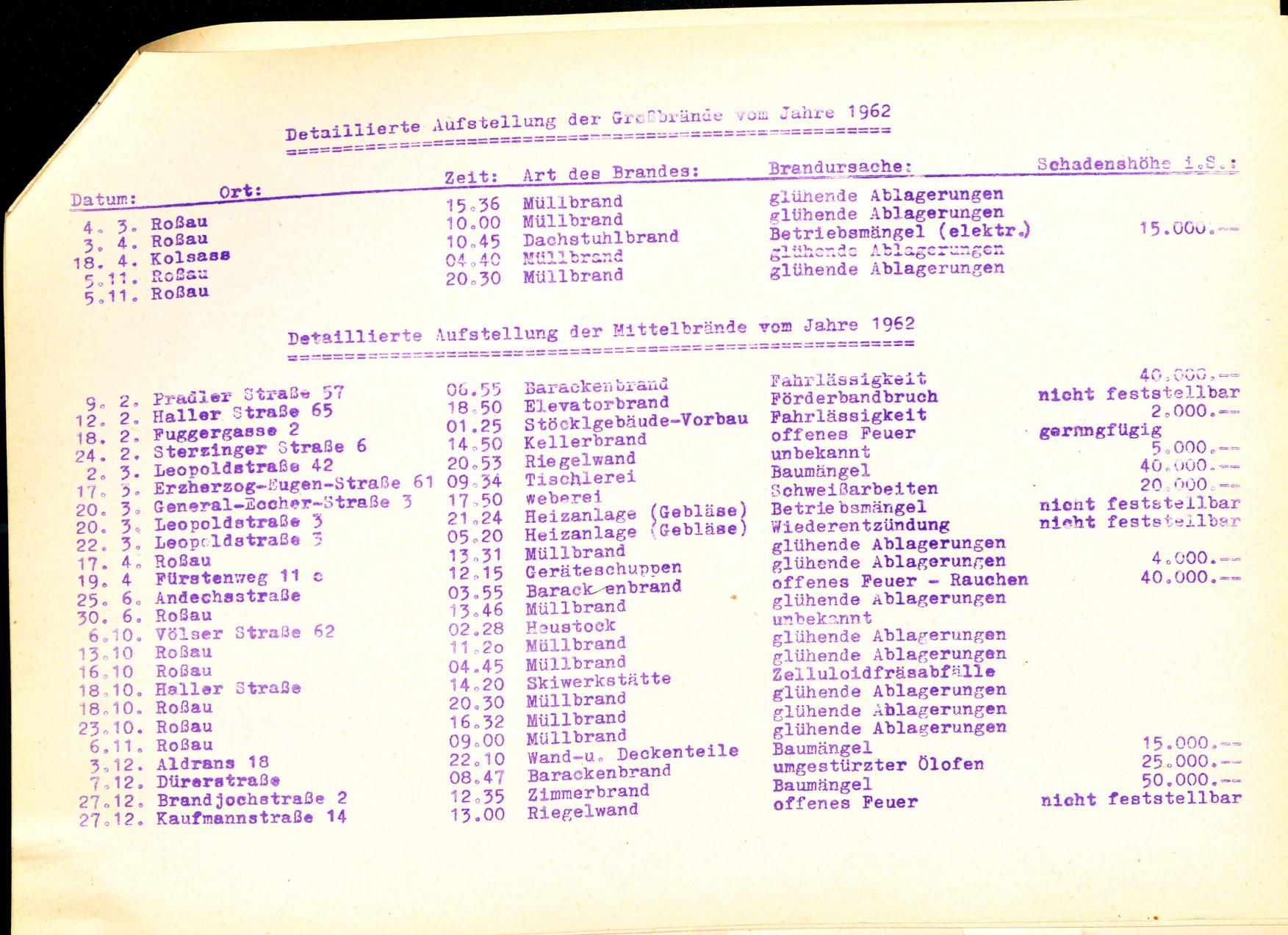 Nachstehend eine detaillierte Aufstellung über vorstehende Brände nach Datum, Ort, Zeit, Art
