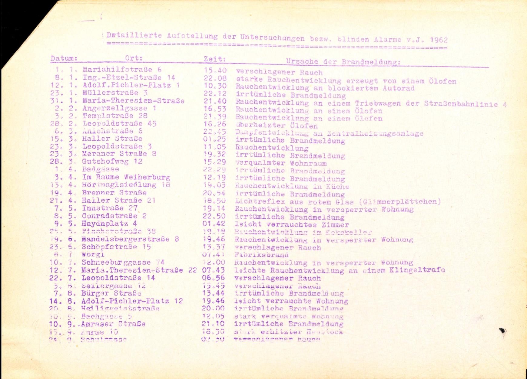 Det2illierte Aufstellung der Wald- und Rasenbrände vom Jahre 1962