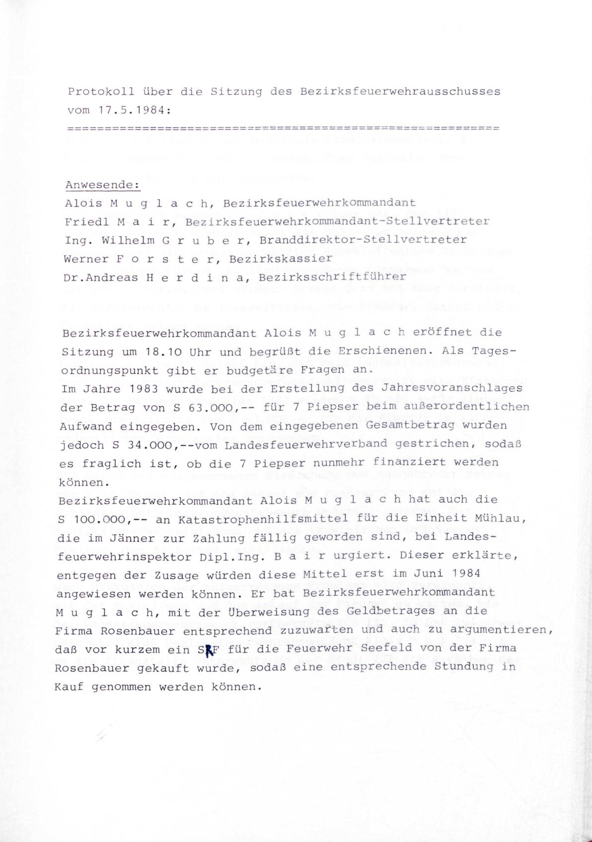 über die Sitzung des Bezirksfeuerwehrausschusses vom 7.5.1984