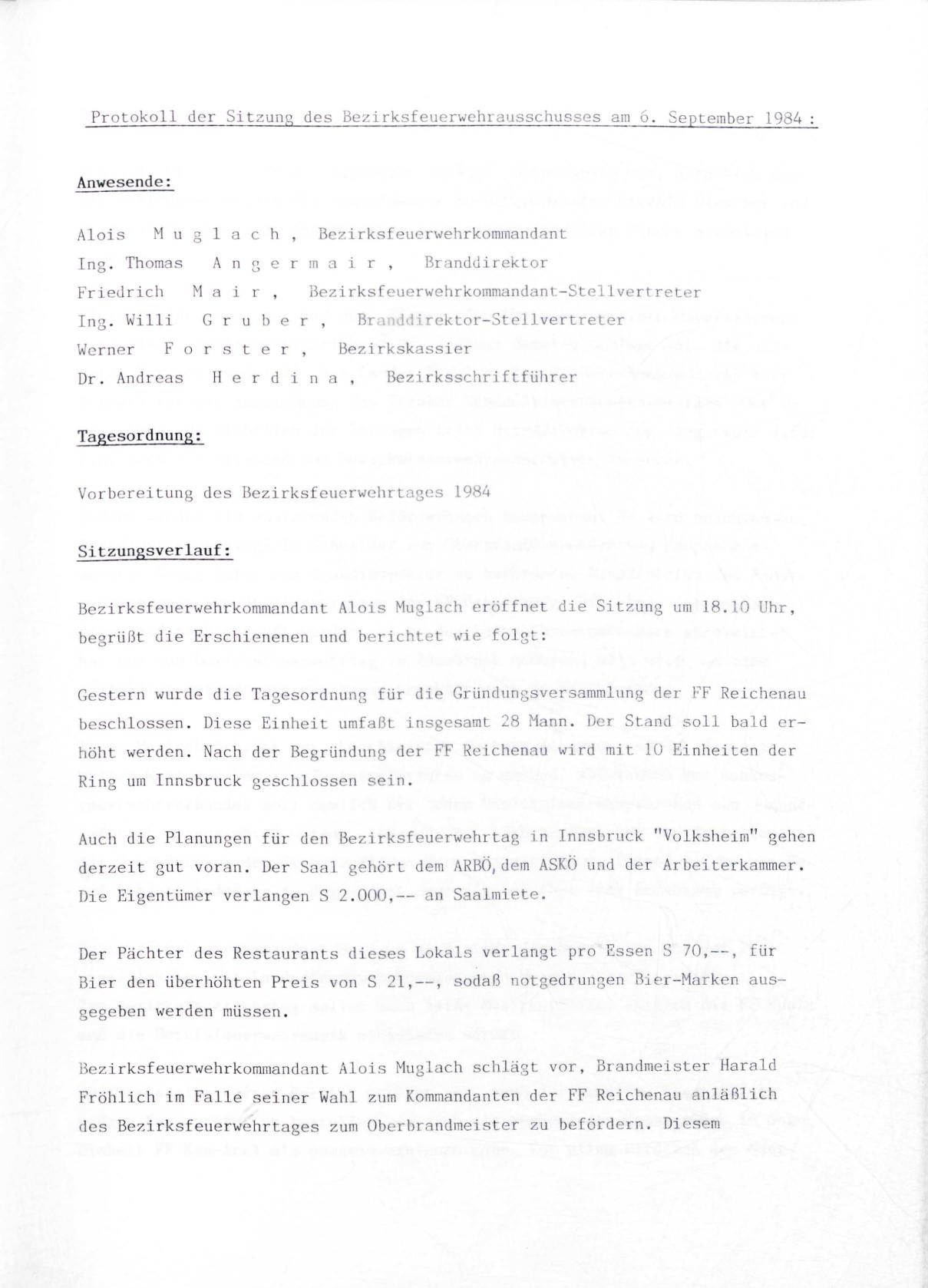 der Sitzung des Bezirksfeuerwehrausschusses am 6. September 1984