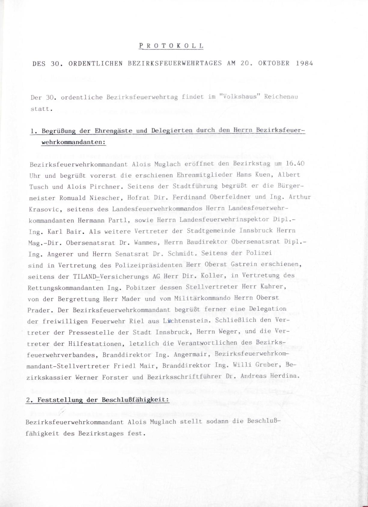 DES 30. ORDENTLICHEN BEZIRKSFEUERWEHRTAGES AM 20. OKTOBER 1984